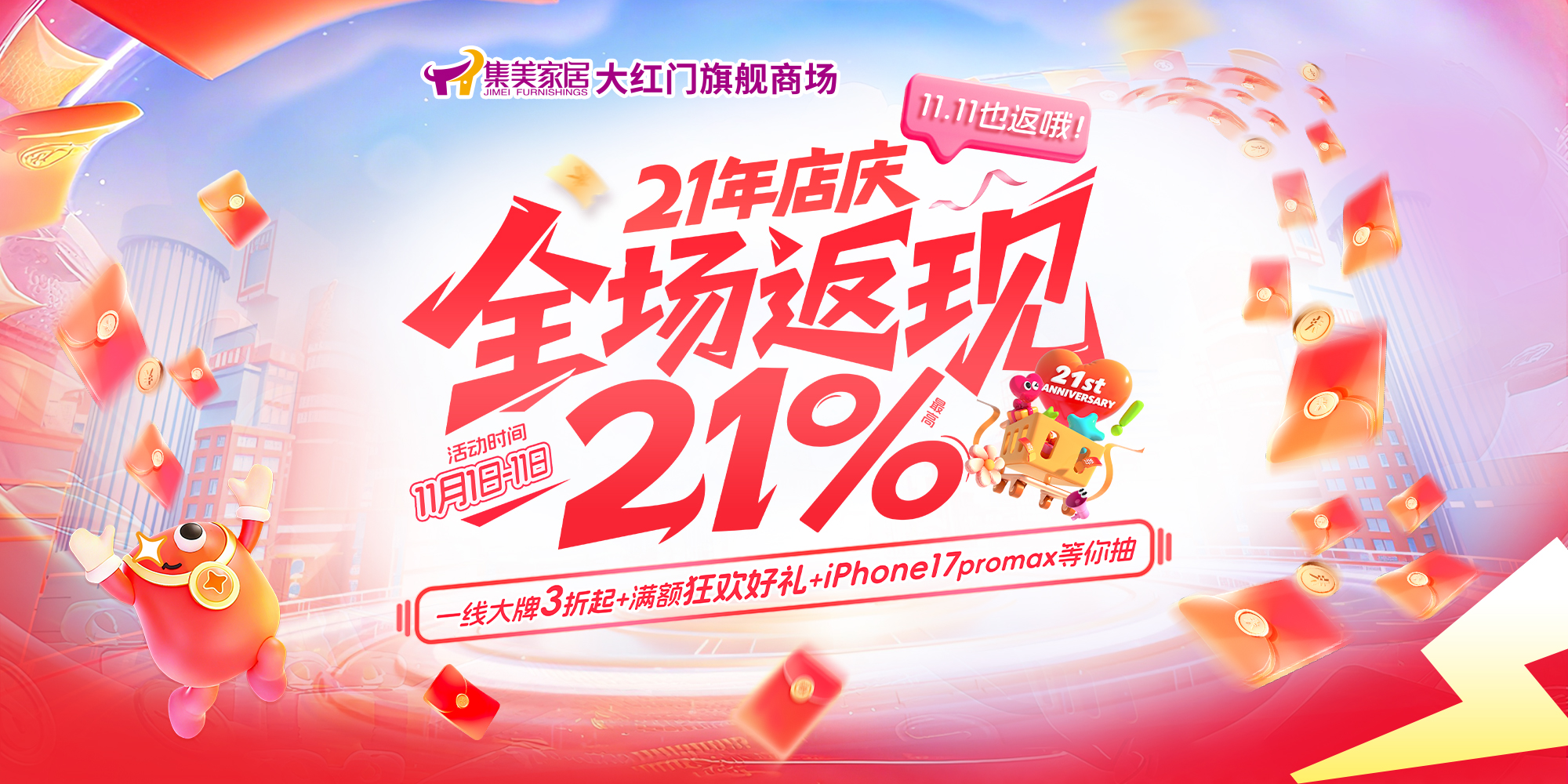 感恩21载,集美家居大红门旗舰商场21岁啦!凡在2025年11月1日-11日购物满1000元的顾客,交清全款,均可享受购物直返,最高立返21%现金活动。多买多返,单笔订单最高立返10000元。