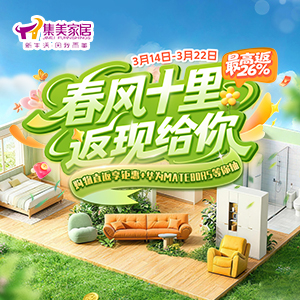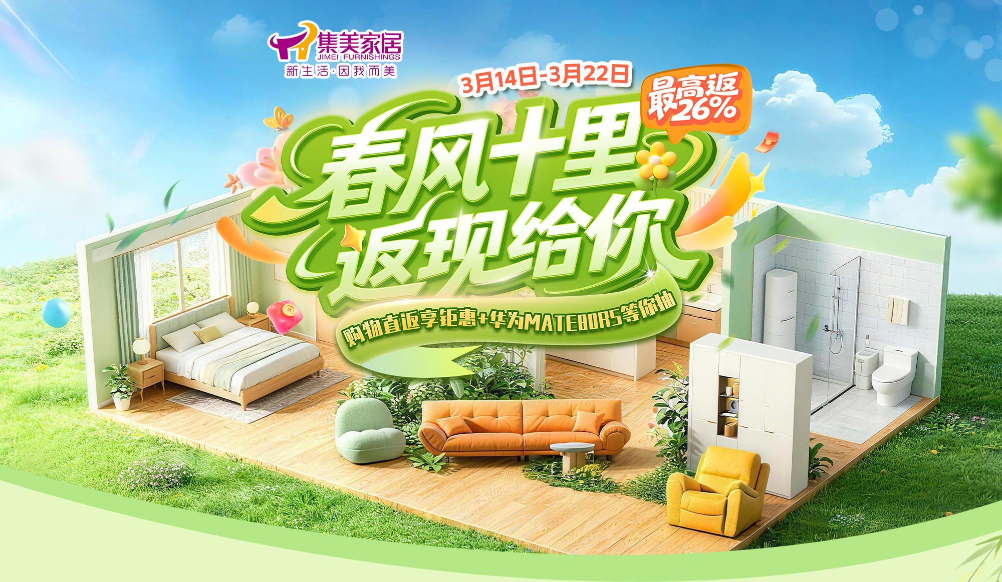 值此315诚信消费季,集美家居大红门商场、定慧桥商场双店同庆,凡在2026年3月14日-22日购物满1000元的顾客,交清全款,均可享受购物直返,最高立返26%现金活动。多买多返,单笔订单最高立返5000元。